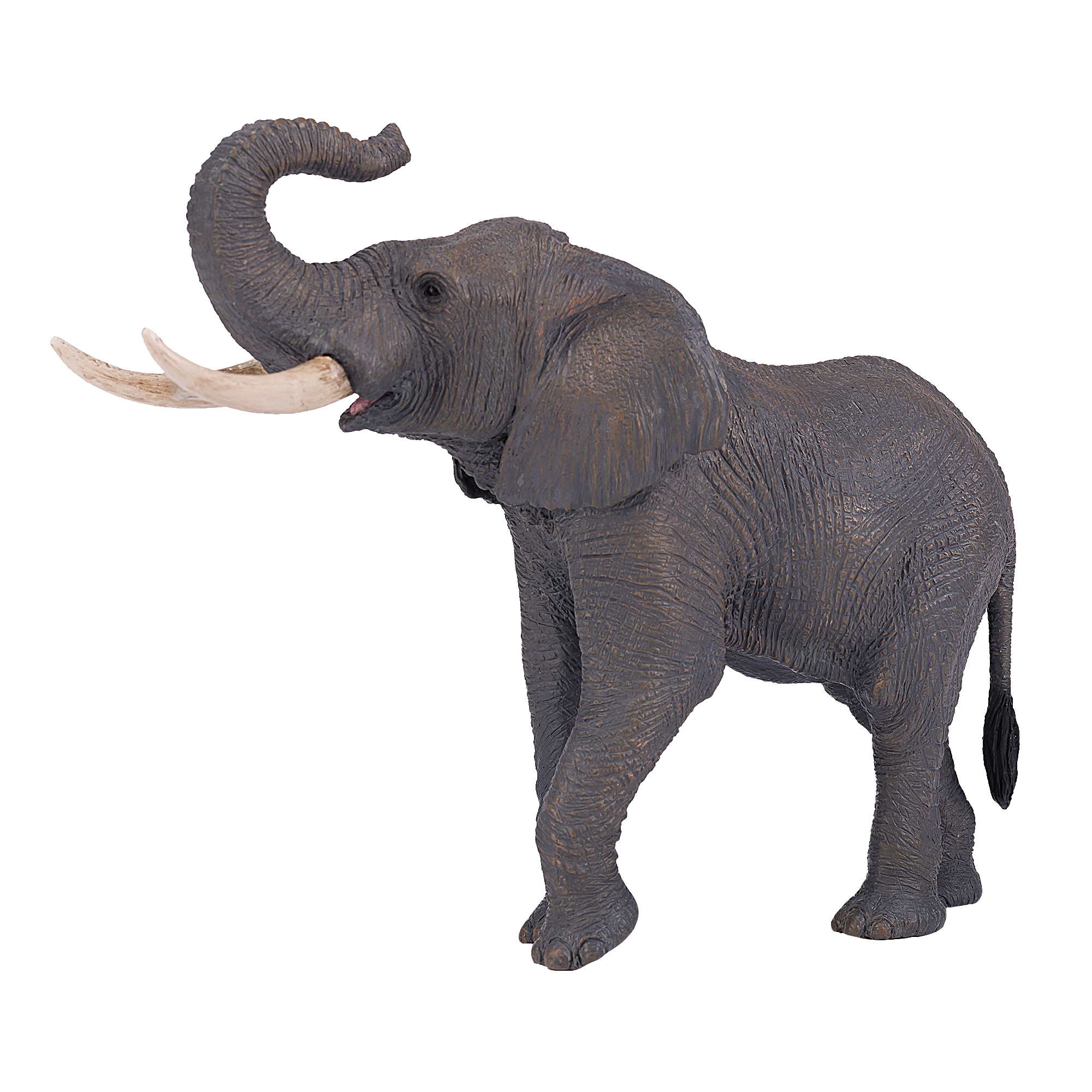 Design: Features a realistic standing pose with intricate details, showcasing the elephant’s large ears, long trunk, and tusks. The textured skin is sculpted to mimic the thick, wrinkled hide of a real elephant, complete with subtle shading that highlights the natural gray color of the species.