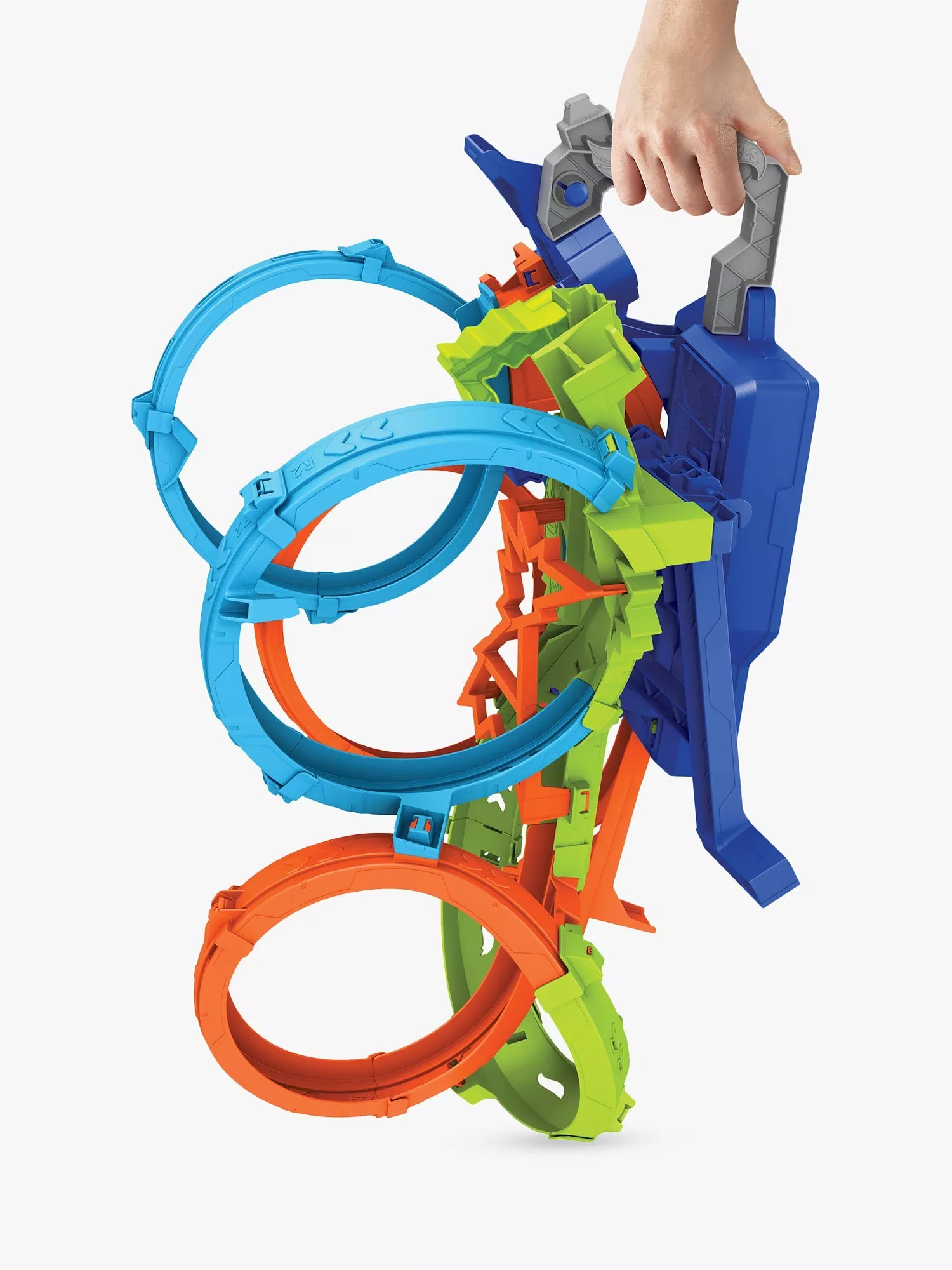 - Motorized booster keeps cars speeding through the loops continuously