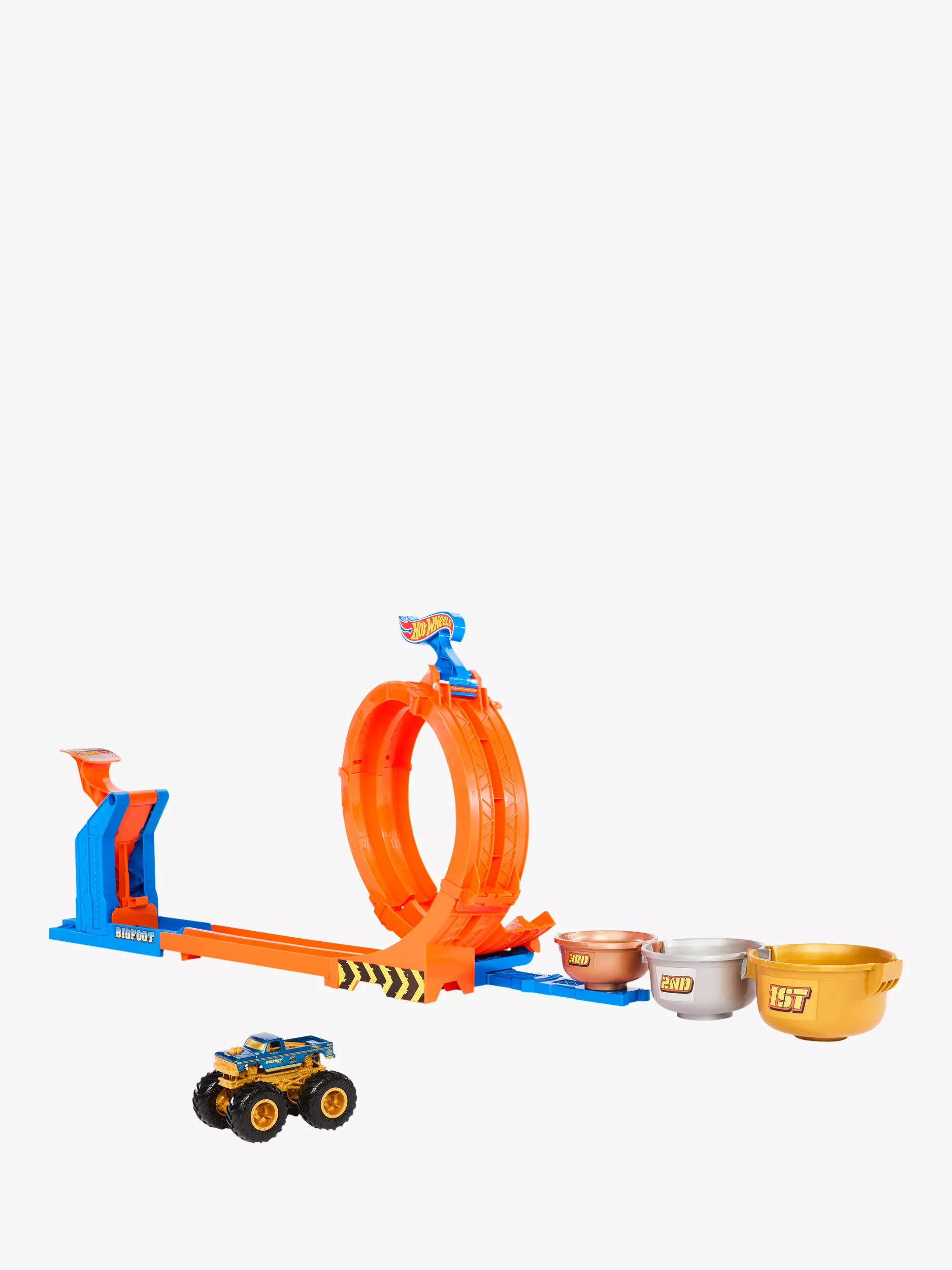Take your racing and stunt skills to the next level with the Hot Wheels MT Loop & Flip Trophy Challenge! This high-energy playset is designed for thrilling Monster Truck action, featuring jaw-dropping loops, flips, and exciting challenges for non-stop fun.