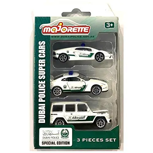 Patrol the city with this 3-piece Majorette Dubai Police car set. Stylish, detailed, and ready for action-packed scenes. • Includes 3 Dubai Police vehicles • Die-cast metal and plastic parts • Free-rolling wheels • Perfect size for small hands • For ages 3+