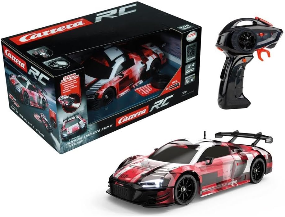 Speed meets steam with the RC Audi RS LMS GT3 Evo II. Packed with design precision and special effects for thrilling RC fun. • Real steam effect while racing • Detailed Audi GT3 design • Remote control driving modes • 1:18 scale model body • Ages 6 and up