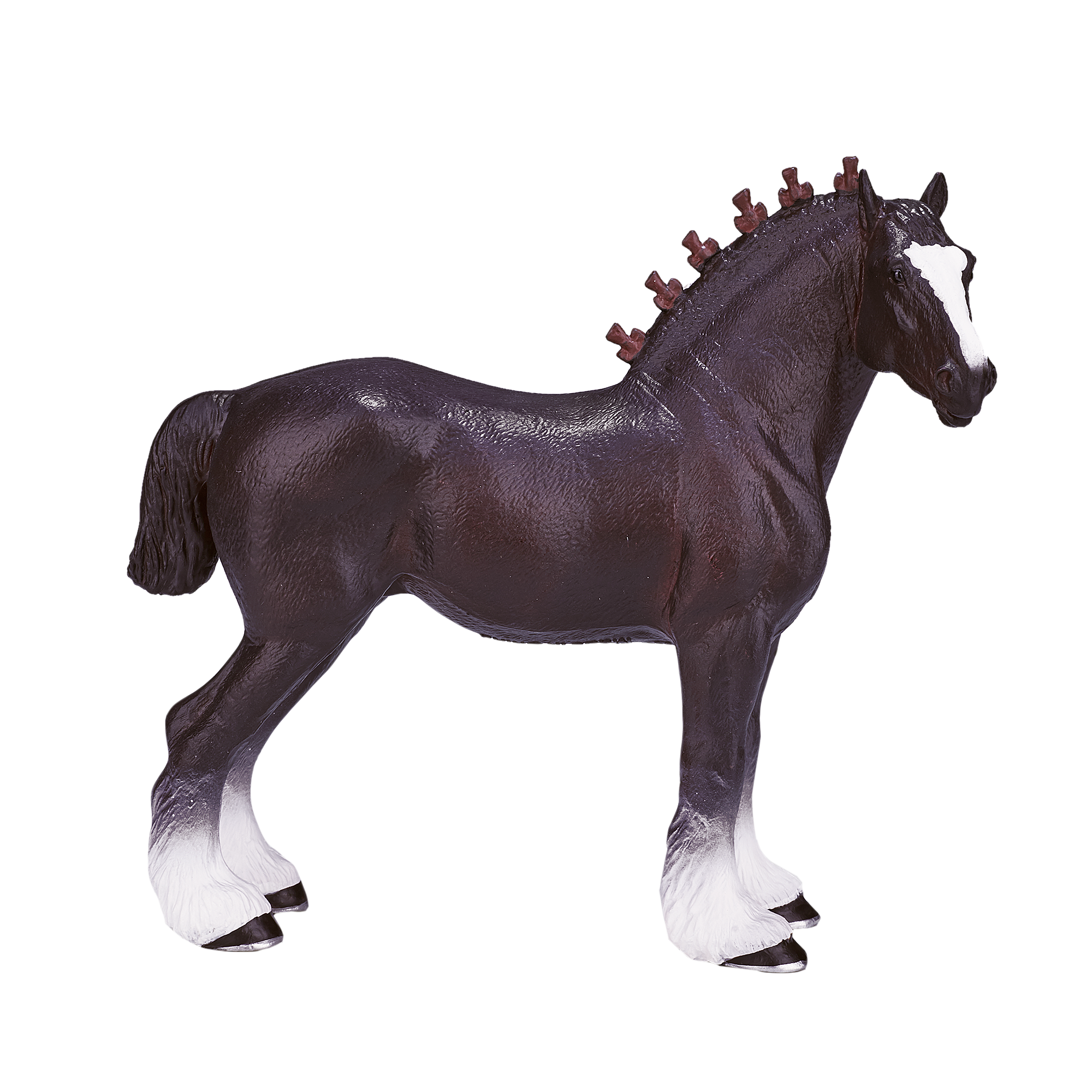 Design: Features a realistic standing pose with intricate details, showcasing the horse’s braided mane, short tail, and muscular build.