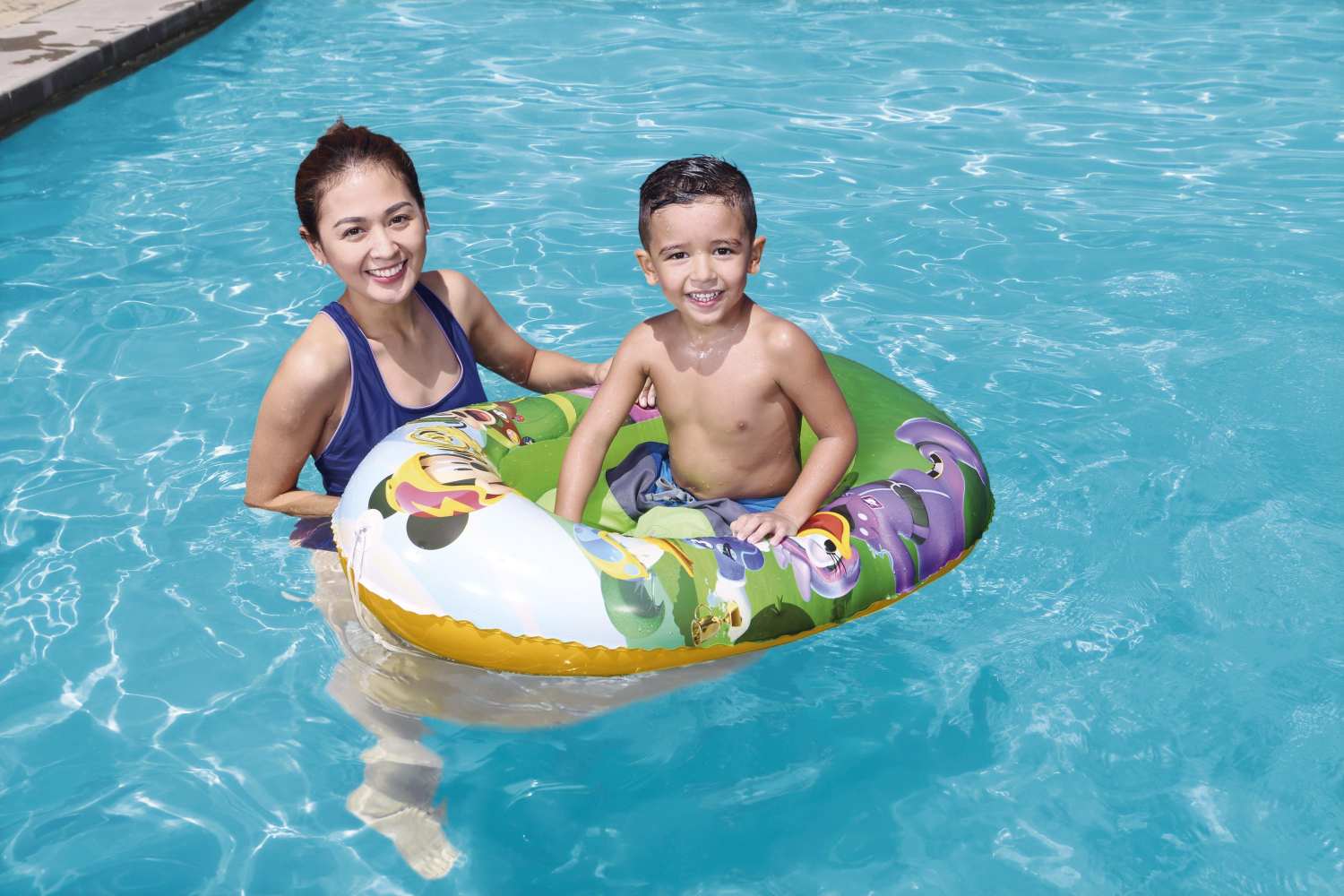 ?Oh Toodles!? Here comes big time fun with the Mickey Mouse Clubhouse Kiddie Raft by Bestway. The raft features an inflatable bottom for extra comfort. A tow rope with a built-in grommet allows the raft to be pulled around in the water while kids can marvel at the sights below in the see-through window. With brightly colored graphics of Mickey and his Clubhouse crew, kids will take great delight in their Mickey Mouse Clubhouse Kiddie Raft at the beach or the pool. Splashing in the sun has never