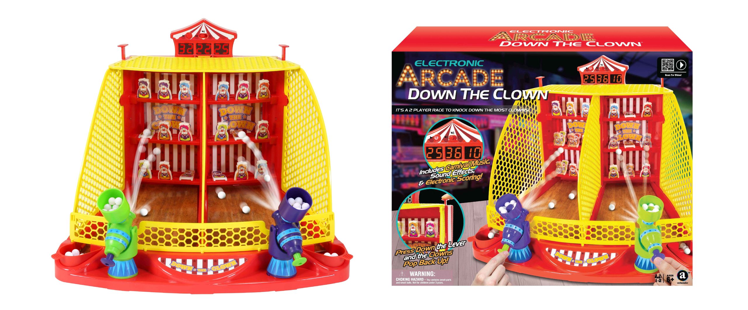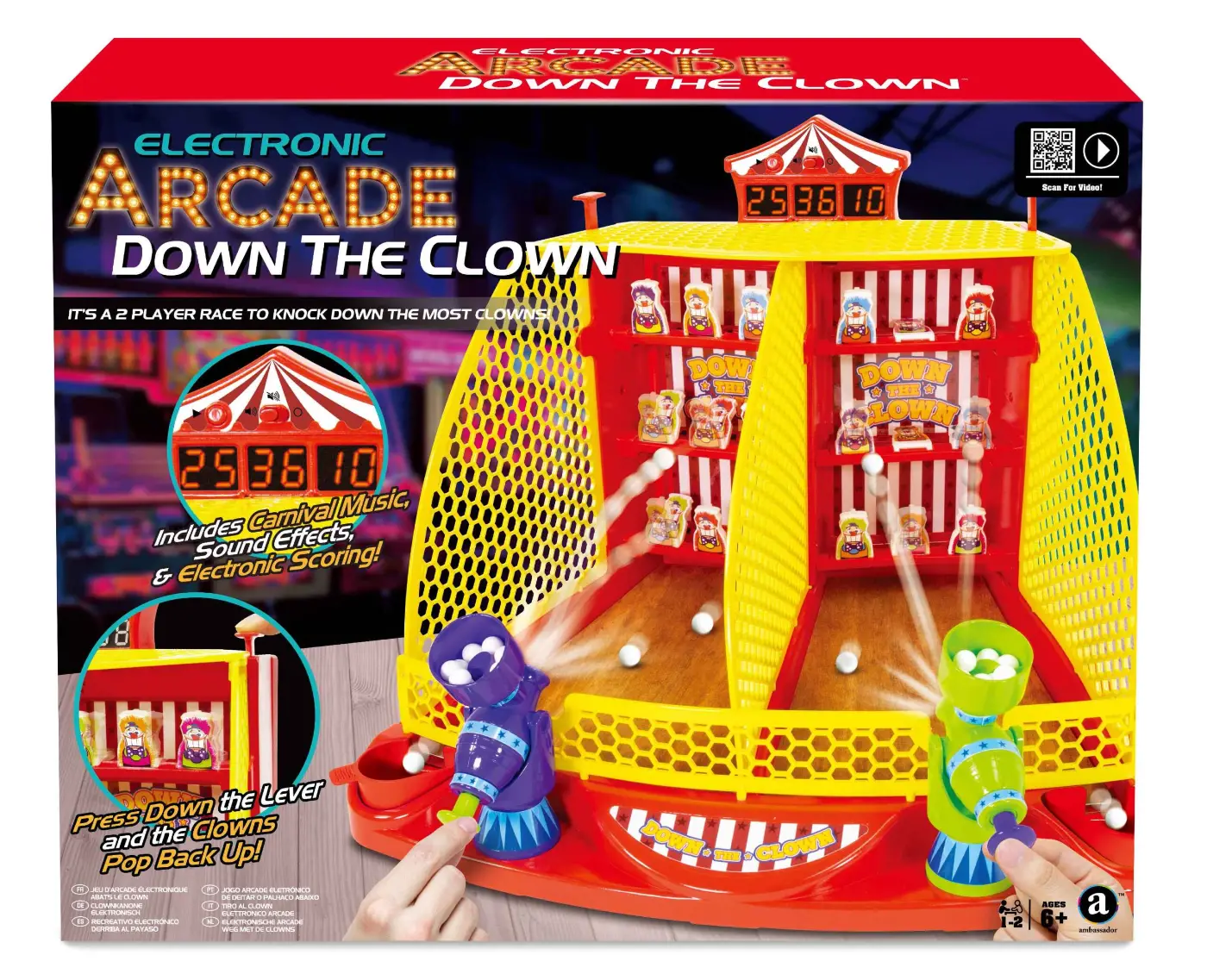 Bring the excitement of the carnival into your home with the Electronic Arcade Down the Clown game! This fast-paced tabletop game challenges players to knock down as many clowns as possible within a 60-second time limit. Perfect for 1-2 players aged 6 and up, it combines skill, speed, and fun for the whole family.