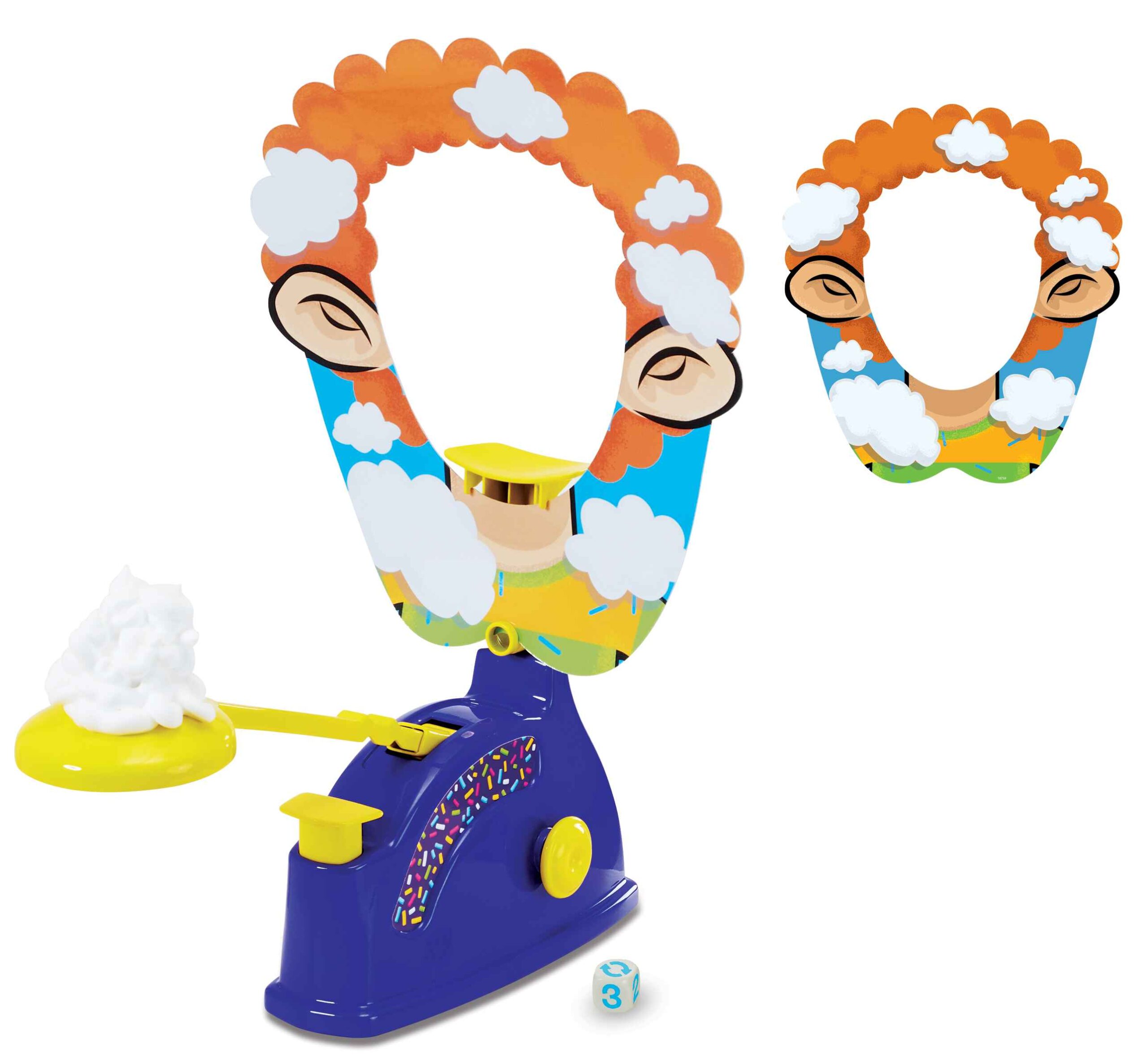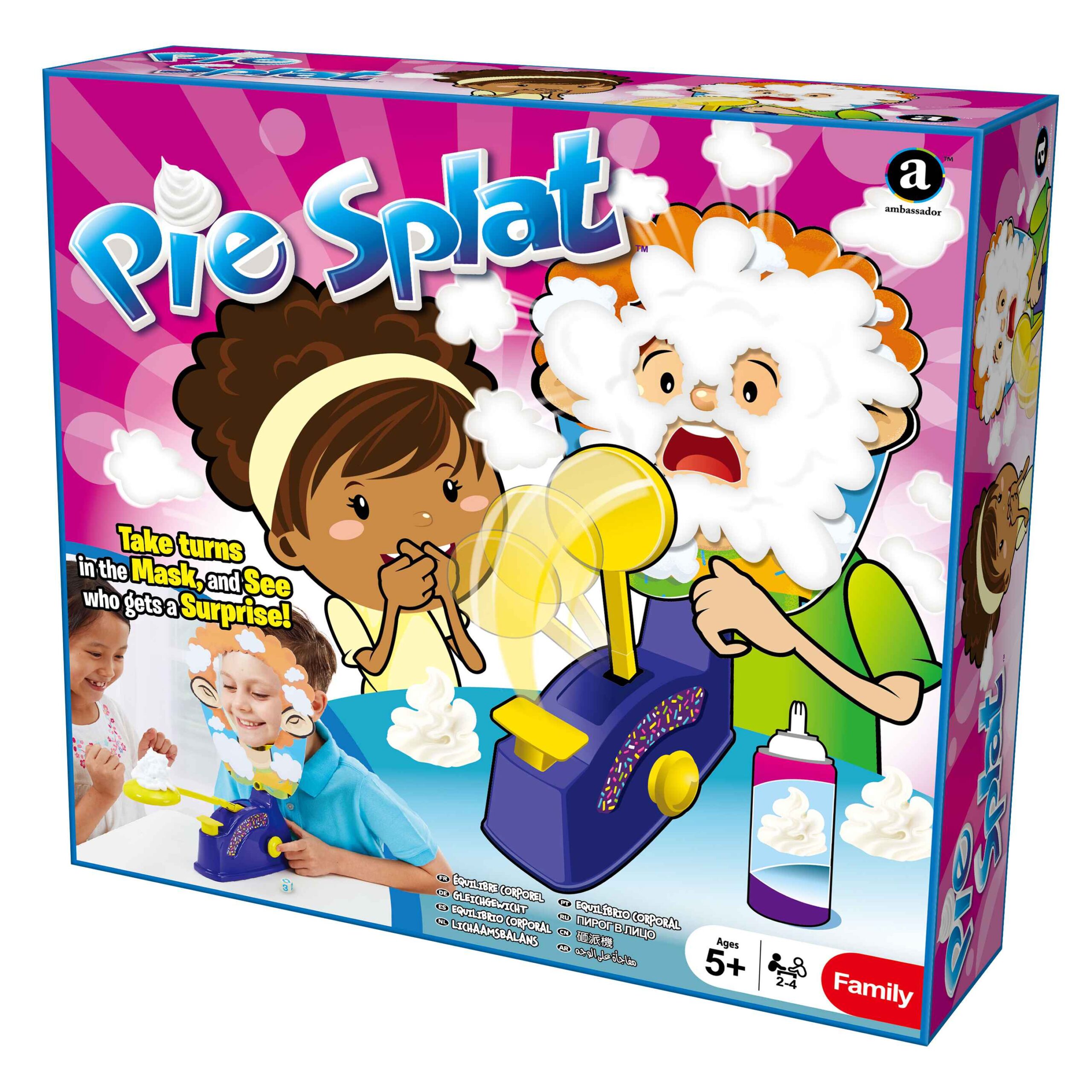 Pie Splat is a delightful and entertaining game designed to bring laughter and excitement to children aged 5 and above. This game involves players taking turns wearing a colorful face shield and rolling a dice to determine how many times to turn a handle. The suspense builds as players hope they won’t be the one to get a surprise splat of whipped cream or a wet sponge in the face.